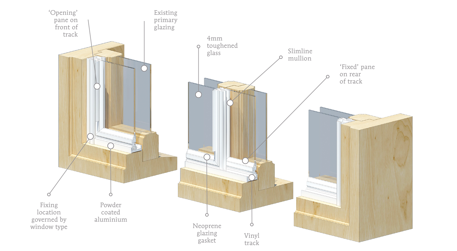 Manufactured from two, three or more panes to suit the primary window. Tailored to accommodate true cills, heads, or splayed reveals as needed.