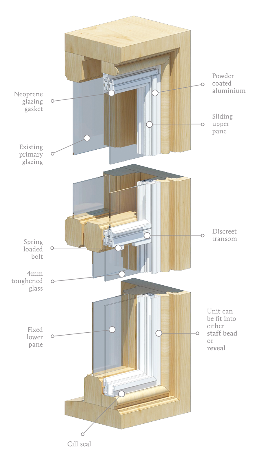 Mounted in the staff beads, enabling retention of working internal shutters. The glazing unit allows the upper pane to be opened, whilst the lower pane remains fixed in place.